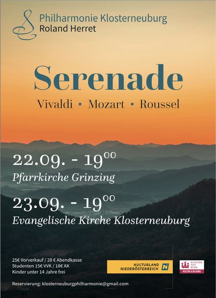 Eine Serenade... ... der Philharmonie Klosterneuburg wird am 23. September in der Evangelischen Pfarrkirche Klosterneuburg stattfinden. Folgendes Programm ist vorgesehen: Wolfgang Amadeus Mozart: Divertimento in F-Dur, KV 138 Albert Roussel: Sinfonietta für Streichorchester Op. 52 Antonio Vivaldi: La Follia op. 1/12, RV63 Benjamin Britten: Simple Symphony Robert Volkmann: Streicherserenade Nr 1 in C-Dur op 62 […]